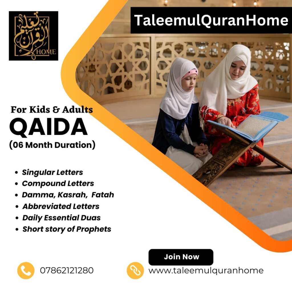 As a result, Noorani Qaida course covers all the areas includes Arabic Numbers, Arabic Alphabet. Also, characteristics and pronunciation of Arabic letters, compound letters, basic rules of Arabic words. And that leads the students from simple to complex ways for the purpose to increase learning gradually. Therefore, without wasting time, you can start to learn Noorani Qaida online at home.